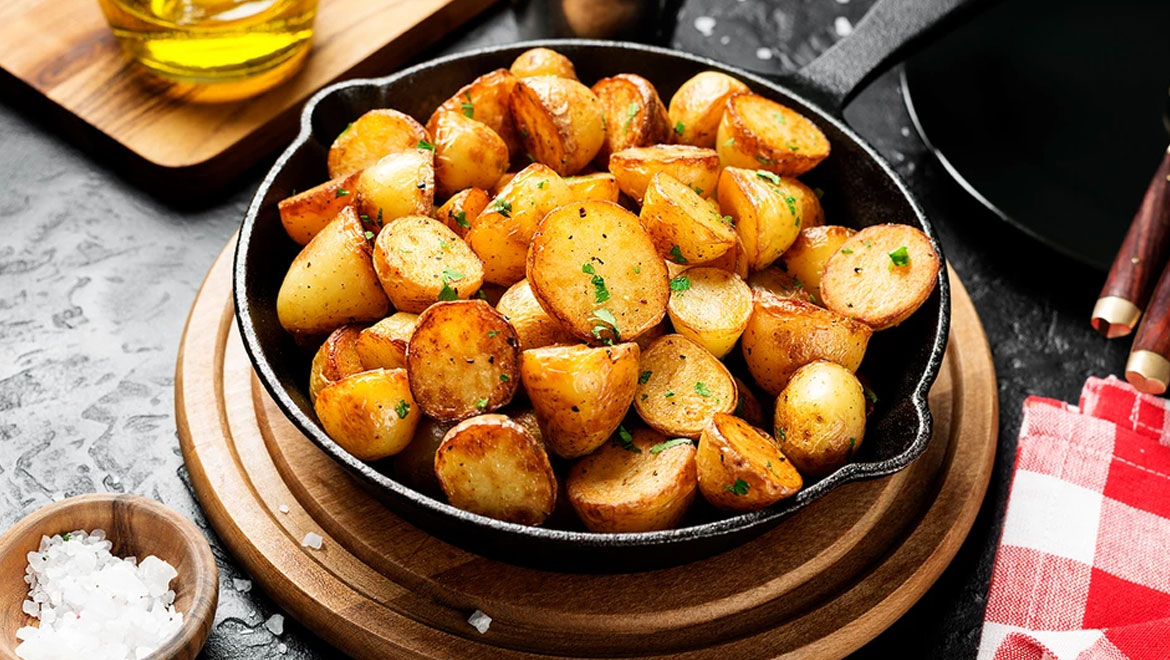 Ρίξτε πάνω στις πατάτες την παρμεζάνα, την τριμμένη φρυγανιά και δύο πρέζες ανθό αλατιού.
