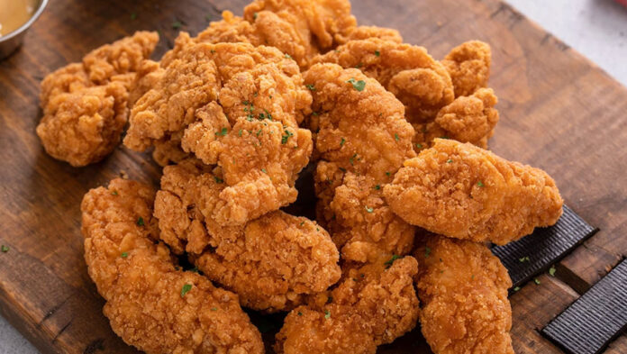 Τοποθετήστε τις επικαλυμμένες λωρίδες κοτόπουλου σε ένα air fryer ρυθμισμένο στους 200 βαθμούς για 15 λεπτά.