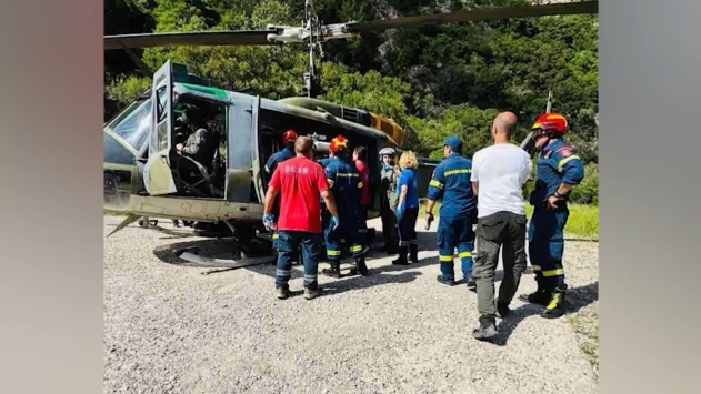 Πυροσβέστες και διασώστες της 6ης ΕΜΑΚ μεταφέρουν το 4 ετών αγοράκι στο ελικόπτερο του ΓΕΕΘΑ κι από στο νοσοκομείο της Καλαμάτας.