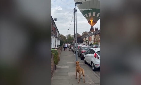 Ένας περαστικός που είχε βγάλει τον σκύλο του για βόλτα σπεύδει να βοηθήσει, καθοδηγώντας το αερόστατο με ασφάλεια στο έδαφος, στη μέση του δρόμου.
