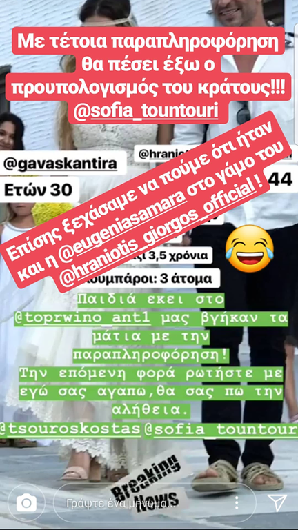 Στο Πρωινό φαίνεται ότι σχολιάζοντας το γάμο δεν είπαν σωστά την ηλικία της νύφης, κάτι που έβγαλε από τα ρούχα της την Ευγενία Σαμαρά η οποία έκανε και το σχετικό instastory, ταγκάροντας τους δυο δημοσιογράφους, την Σοφία Τουντούρη και τον Κώστα Τσουρό.