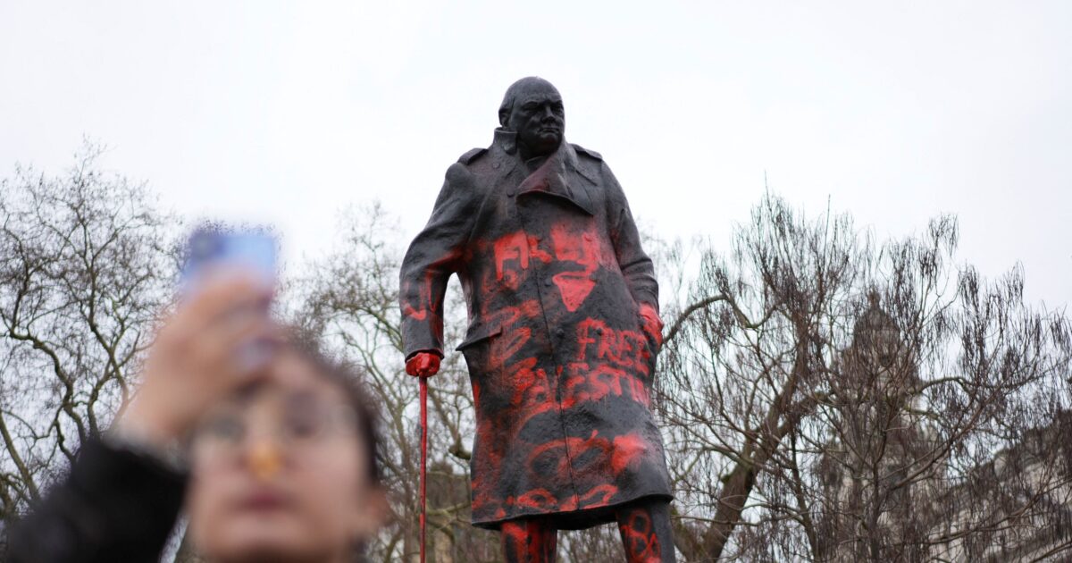 Στο άγαλμα του Γουίνστον Τσόρτσιλ έγραψαν «Σιωνιστής εγκληματίας πολέμου» στην μπροστινή όψη και «Ποτέ ξανά τώρα» στην πίσω όψη, καθώς και τις φράσεις «Ελευθερώστε την Παλαιστίνη» και «Σταματήστε τη γενοκτονία»Στο άγαλμα του Γουίνστον Τσόρτσιλ έγραψαν «Σιωνιστής εγκληματίας πολέμου» στην μπροστινή όψη και «Ποτέ ξανά τώρα» στην πίσω όψη, καθώς και τις φράσεις «Ελευθερώστε την Παλαιστίνη» και «Σταματήστε τη γενοκτονία»