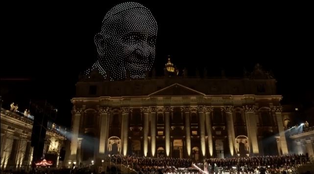 Με τη βοήθεια drones, η μορφή του Πάπα Φραγκίσκου φώτισε τον ουρανό της Ρώμης επάνω από το Βατικανό.