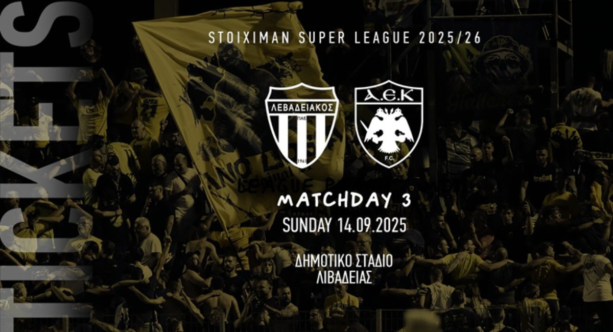 Η ΠΑΕ ΑΕΚ ενημερώνει τους φιλάθλους της ομάδας μας ότι άρχισε η διάθεση των εισιτηρίων για την εκτός έδρας αναμέτρηση της 3ης αγωνιστικής της Super League 2025-2026 απέναντι στον Λεβαδειακό, η οποία θα διεξαχθεί την Κυριακή 14 Σεπτεμβρίου (20:00), στο Δημοτικό Στάδιο Λιβαδειάς «Λάμπρος Κατσώνης».